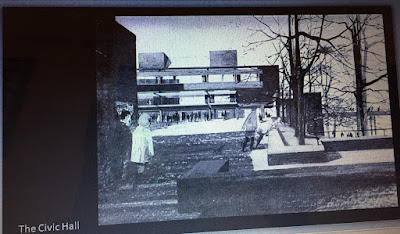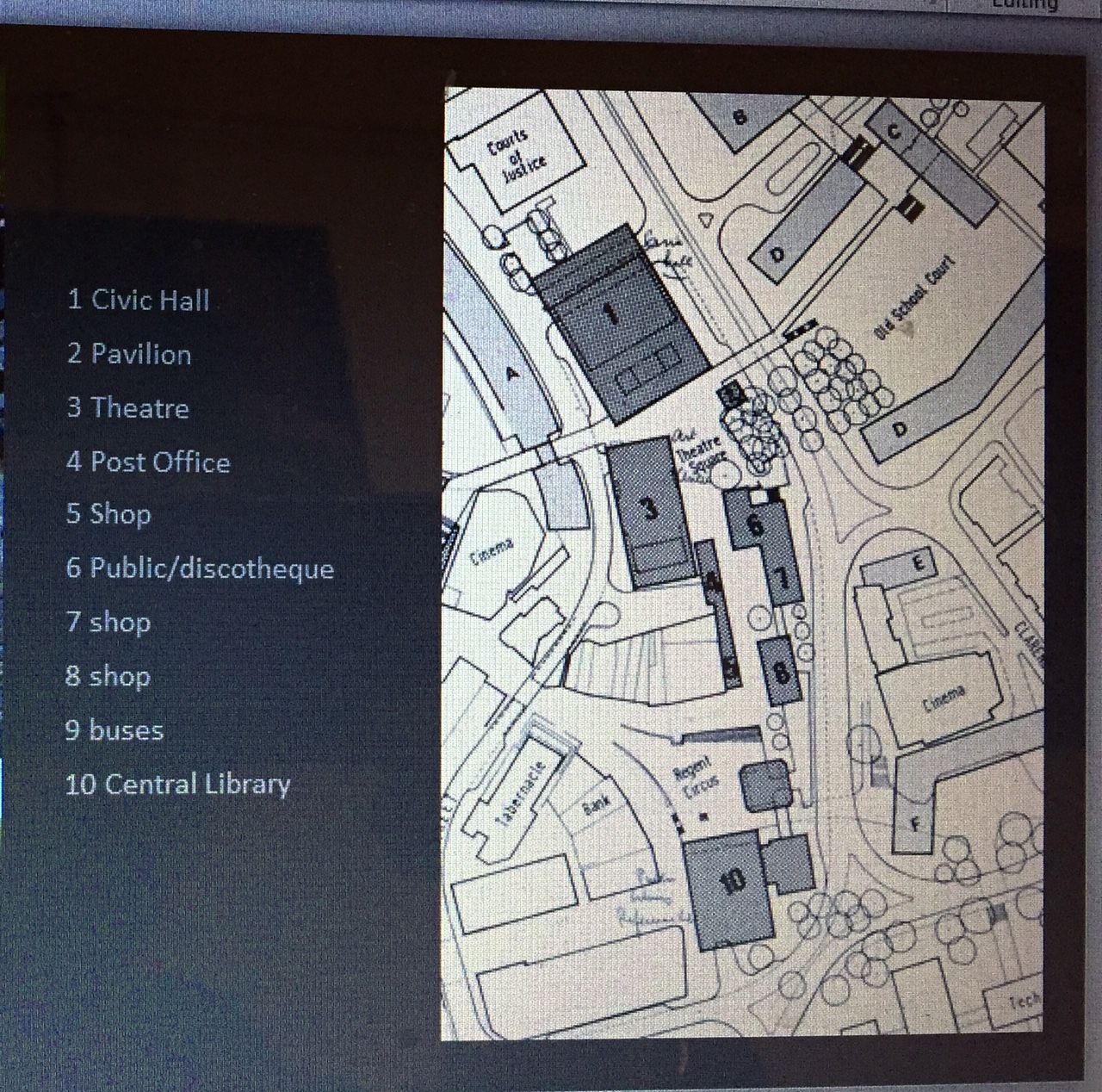Michael started with the history of architecture, beginning with Corbusier in the 1930s. He had an excellent Power Point presentation to illustrate his talk, I have photographed some of the slides, to show the plans drawn up in 1966 when towns and cities all over the country were encouraged by the Wilson government to foster the arts and were given funding to build the necessary infrastructure to support this. The original plan suggested demolition of the Town Hall and retention of the Tabernacle, in fact as we now know, the Tabernacle was demolished and the Town Hall retained. I have photographed some of the Power Point slides starting with the Civic Centre Master Plan from 1966: